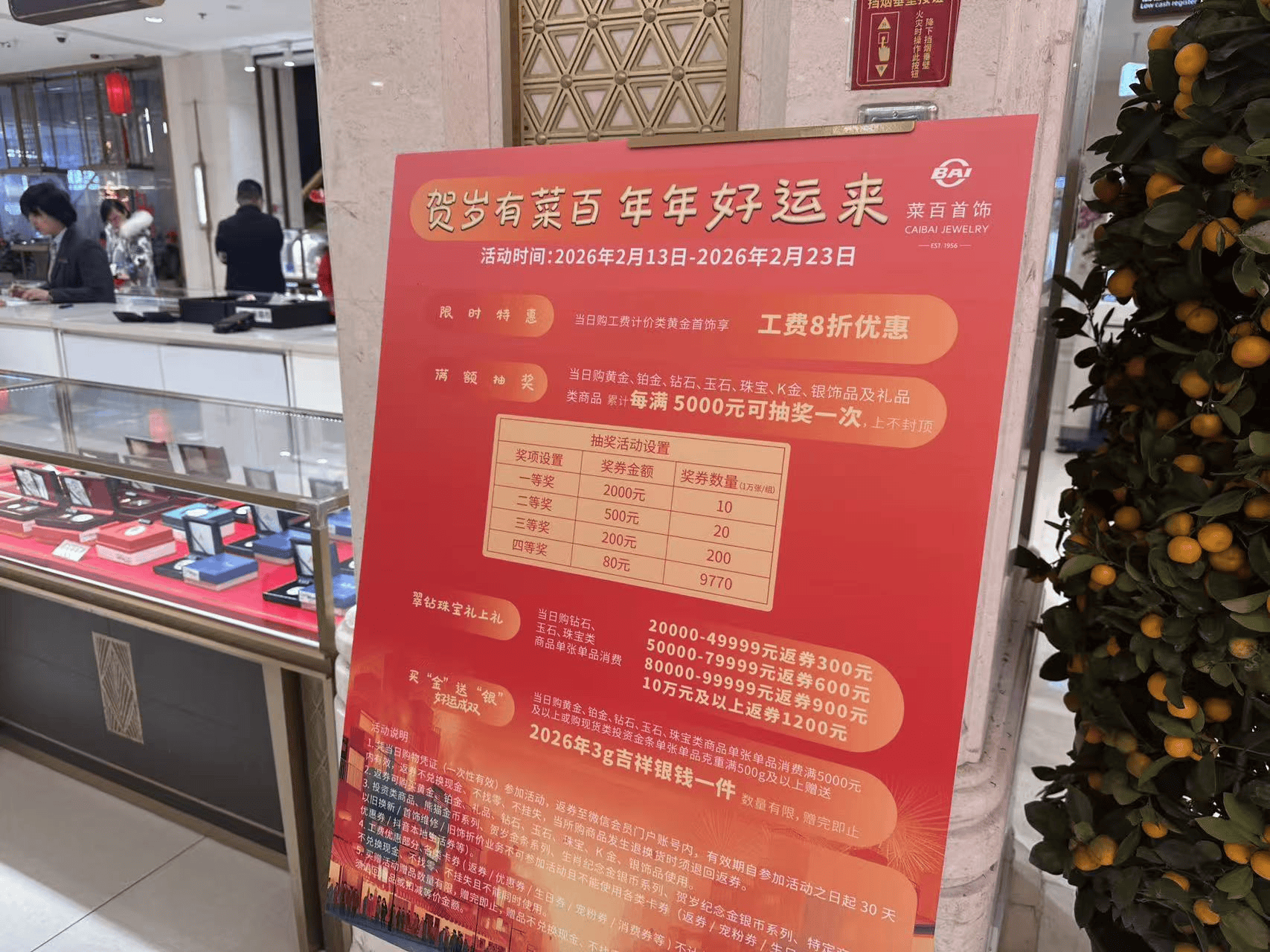 春节期间(2月13日-2月23日),北京菜百总店推出限时特惠,当日购工费计价类黄金首饰享工费8折优惠;当日购黄金、铂金等累计满5000元可抽奖一次,上不封顶。